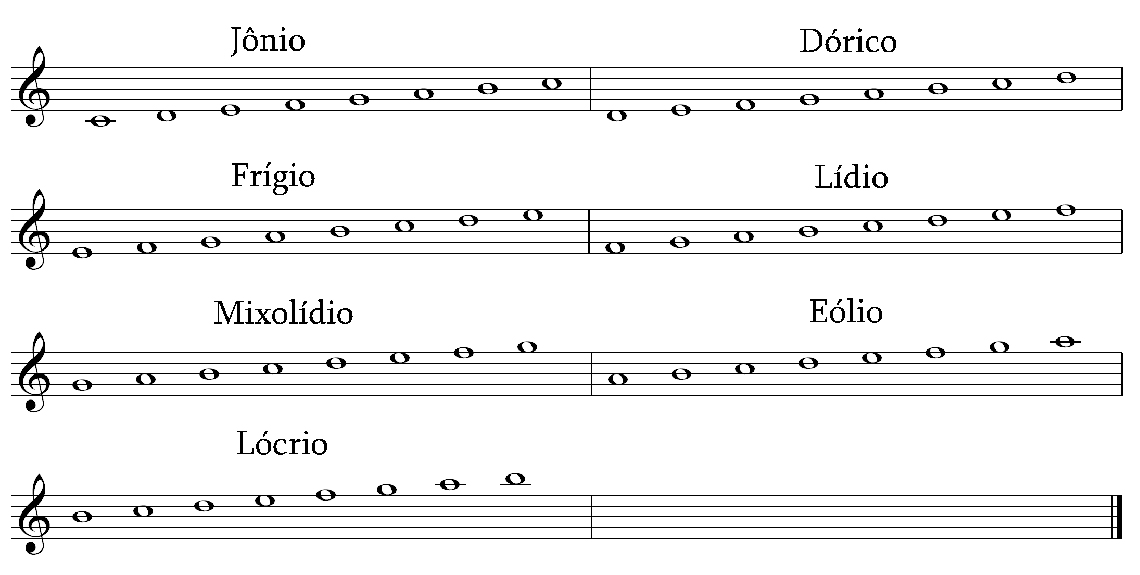 Para explicar o que são modos gregos, devemos entender primeiramente o que são escalas. A escala é o conjunto mínimo de notas e a sucessão de intervalos particulares que se combinam para formar frases melódicas (Wisnik 2017, 73). O termo “escala” pode ser substituído por “modo” ou “gama”. As escalas são criadas a partir de um contexto cultural, como é o caso dos Modos Gregos, que tem sua origem na Grécia Antiga, mas sofreram alterações com o desenvolvimento da estrutura musical e alteração cultural. Os modos gregos Dórico, Mixolídio, Frígio e Lídio, a princípio eram constituídos apenas por quatro notas, diferentemente de hoje que utilizamos o dobro de notas, além disso, os gregos antigos consideravam as escalas no sentido descendente e não ascendente (Med 1996, 165). No século XVI foram acrescentados os modos Eólio e Jônico, somados aos já existentes, para formar o sistema que conhecemos hoje.
