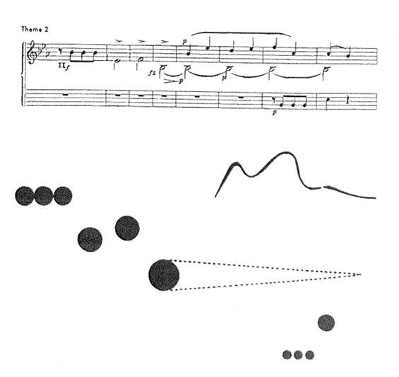 No capítulo dedicado ao Ponto, Kandinsky (1997) expressa o interesse pela obra de Beethoven, quando nos apresenta quatro representações de trechos da Quinta Sinfonia, entre elas a da Figura 3. Dessa maneira, ele propaga a relação entre a sonoridade da música de Beethoven e suas possíveis representações visuais.