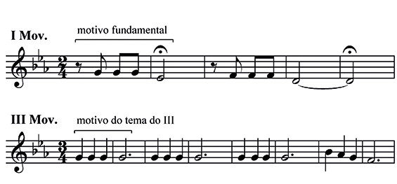 Comparando os temas do I e do III movimentos (Figura 4), é fácil perceber que no III Beethoven apresenta uma reiteração variada do motivo fundamental exposto no início da obra. A marca rítmica de três notas curtas e uma longa é presente nos dois temas, mas a semelhança entre ambos pode ser destacada também pelos aspectos melódico e harmônico. No melódico, o intervalo de 4ª justa demarca o âmbito das duas linhas que têm sentido predominantemente descendente (Sol – Ré, no tema do I; Sib – Fá, no tema do III). E a harmonia em ambos os trechos pode ser sintetizada partindo da função da tônica (I grau da escala; repouso) das respectivas tonalidades (Dó menor, no I; Mib maior, no III) em direção à dominante (V grau da escala; tensão) dessas tonalidades.