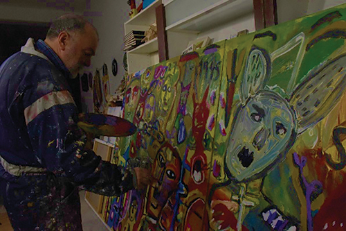 Figura 7 - Agostinho Santos, no seu ateliê, a pintar um quadro sobre o Holocausto