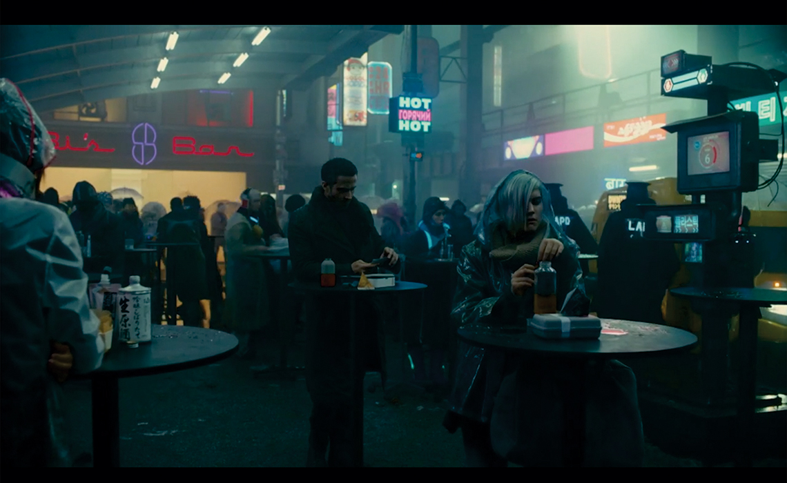 Alguns ambientes de Blade Runner 2049 remetem ao primeiro filme Blade Runner (Ridley Scott 1982). A cidade é retratada por meio de um cenário escuro e repleto de fumaça, prédios, sinais luminosos e hologramas. Por outro lado, há também ambientes nada poluídos, constituídos por muitas linhas retas e ângulos precisos.