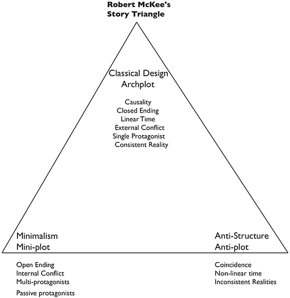 Based on the important film scriptwriting scholar, Robert Mckee, He proposes the story triangle in his famous book. He categorizes the most stories in film into 3 classifications. The majority is Archplot, the others are miniplot and antiplot.