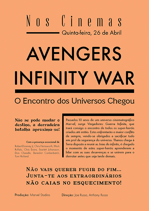 A razão pela escolha de filmes dentro destas categorias deve-se ao facto de estes serem filmes bastante presentes nos dias de hoje e onde a imagem e os efeitos especiais se encontram fortemente presentes, algo que não acontecia nos anos de 1946 a 1951. Desta forma, conseguia-se aumentar a dificuldade de traduzir toda a imagem em texto, misturando o passado com o futuro. Assim sendo, foram selecionados os filmes, Wonder Woman, Batman vs Superman – Dawn of Justice, Guardians of de Galaxy vol.2, Avengers Infinity War, Thor – Ragnarok e Aquaman, tendo sido feita uma pesquisa em torno das suas características e sinopses. Para além disto, os cartazes criados para a divulgação de cada um dos filmes, assim como os seus trailers, e comentários críticos encontrados na internet, foram uma mais valia para o aumento do conhecimento e inspiração para as criações dos cartazes finais. Estas foram então todas as bases de informação que deram origem a todos os elementos textuais presentes em cada um dos cartazes desenvolvidos.