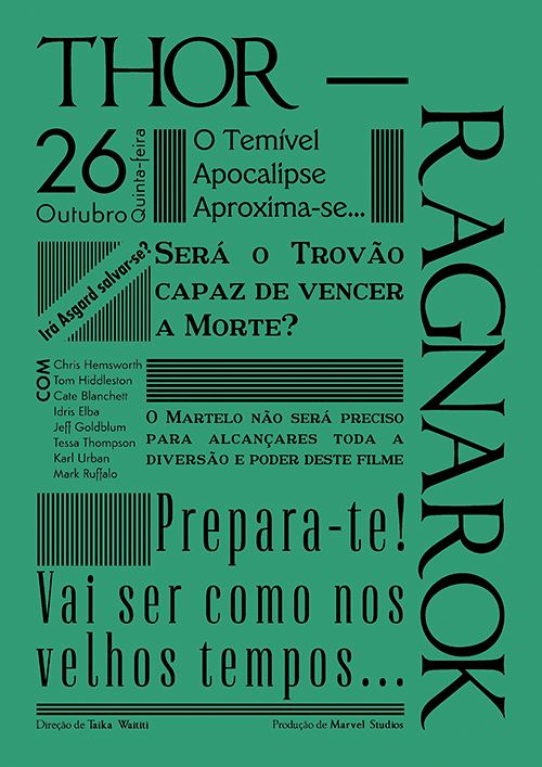 Nesse sentido, selecionou-se um dos seis cartazes, o filme Thor - Ragnarok, e a partir deste iniciou-se um ciclo de experiências tendo sido testados variados cartazes de forma a aproximar-se cada vez mais das criações mais contemporâneas, de onde o trabalho tipográfico da designer Paula Scher, entre outros, serviu de inspiração.