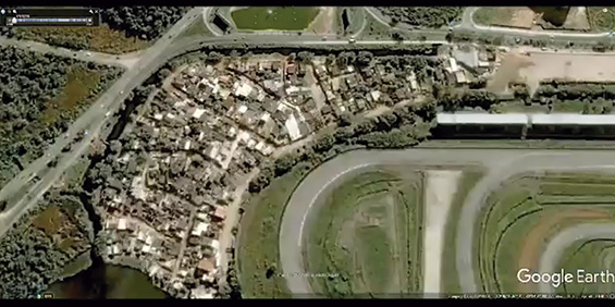 Na instalação Museu de um Mundo Estilhaçado, o sujeito imerge em um mundo findo, como uma consciência, em uma constelação de estilhaços de memória, de um espaço destruído por um poder constituído e à revelia de parte de seus moradores. A experiência é realizada com imagens aéreas de georreferenciamento e imagens geoespaciais, de mídias locativas como o do Google Street, Maps, Earth e do Earth Engine, que permitem a localização geográfica, física, social, demográfica e econômica. Através desse ponto de vista zenital, novas produções de sentido emergem e podem gerar valor, significância e intersubjetividade na análise de um tema cuja cartografia, a Remoção da Vila Autódromo (figuras 1,2,3,4), comunidade constituída em Jacarepaguá, Rio de Janeiro, Brasil, resgata e valoriza a memória social do local.