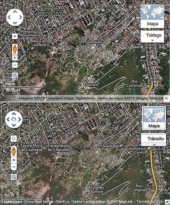 E, os “ninguéns” acontecem, na cidade do Rio de Janeiro, de forma crônica e sistemática, através de práticas excludentes, extrativistas e colonialistas, desde a sua construção. Ecoam em ondas de consequências e de repetições de práticas políticas, na cidade do Rio de Janeiro, do início do século XX até os dias de hoje. Se não, vejamos a solicitação feita pela Prefeitura da Cidade do Rio de Janeiro, através da Riotur - Empresa de Turismo Municipal do Rio de Janeiro e acatada pelo Google Maps (figura 5), quanto da retirada do termo ‘favela’ do mapa da cidade, na procura de dar invisibilidade à pobreza que assola, pelo menos, um quarto da população trabalhadora da cidade, por conta da cidade sediar a Copa do Mundo, em 2014 e a Olimpíada, em 2016, noticiada no jornal O Globo 2011 e Comitê Popular do Rio, 2013 (Nemézio e Oliveira 2016, 7).