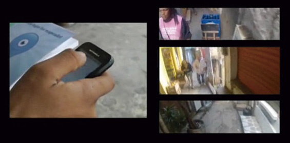 No frame representado na Figura 6, acrescenta-se a tudo isso a tela do telefone móvel dentro do quadro audiovisual, gerando um movimento do olhar não só longitudinal/latitudinal, mas também um mergulho, um dobrar-se por sobre a tela maior chamando a atenção para a importância daqueles aparelhos na criação das contra-cartografias. O projeto Wiki Mapa é feito com a colaboração de jovens das comunidades que, munidos de celular, redesenham o espaço urbano incluindo endereços apartados dos mapas turísticos no georreferenciamento criado pela ONG (Organização Não Governamental).