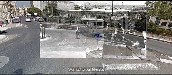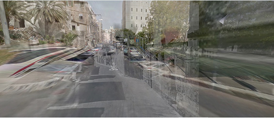 Se, por um lado, o documentário Todo mapa tem um discurso cria na tela a sua própria cartografia, certos filmes “invadem’’, entram dentro do mapa para sublinhar as mudanças acontecidas a partir de um determinado evento. É o caso do filme Your father was born a 100 years old, and so was the Nakba, 2017, da palestina Razan Alsalah, que entra no Google Street View, encarnando a sua avó, através dos fragmentos de lembrança do pai da cineasta, ambos refugiados palestinos que não puderam voltar a sua terra natal – e, a possibilidade de alguma conexão, da cineasta, também neta e filha, com o lugar e as memórias do passado de sua família, através do Google Streetview.O filme usa a poética do glitch “borrando” o deslocamento de algumas imagens e a estética do apagamento para contar através de uma história pessoal, a perda, a injustiça e a distância de tantos refugiados arrancados, por imposição, de sua terra. Dentre os recursos de montagem utilizados, podemos observar a sobreposição de imagem, evidenciando tempos distintos que se confrontam (Figura 10), criando fantasmagorias (Figura 11).