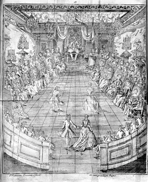 The manuals that I have referred to, as well as other sources from the time (correspondence, memoirs, engravings, among others), always present the royal ball or the court dance as a model. It is possible to find several descriptions of the etiquette to be observed, as well as engravings that purport to depict a particular dance as it was performed (or what it should have looked like). In these documents we find figures represented hierarchically and carefully distributed in space, the dancing couple assigned a central position, in a way that makes them the focus of all the rest. We also know that the ball always took place as part of the festivities celebrating important events in the life of the royal family, such as birthdays, baptisms, and weddings.