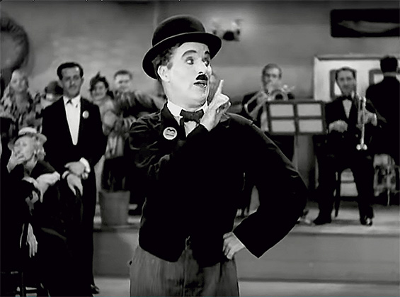 O momento em que ouvimos a voz de Chaplin, é movido novamente pelo inusitado e pelo acidental. Charlot, a trabalhar com Ellen num restaurante, tem que cantar para entreter os clientes. Como não consegue decorar a letra da canção, Ellen escreve-lhe o texto na manga do casaco. A sua performance é magnífica e nonsense; é sob essa toada musical que Chaplin se movimenta. Na sua amplitude física de gestos, num entusiasmo frenético, faz a manga voar do seu punho e sair do enquadramento. Foi-se o texto escrito por Ellen, foi-se o dictatum, enquanto Chaplin adia e persevera no seu silêncio. Ellen sugere-lhe que cante, porque as palavras não interessam (“Sing! Never mind the words”).