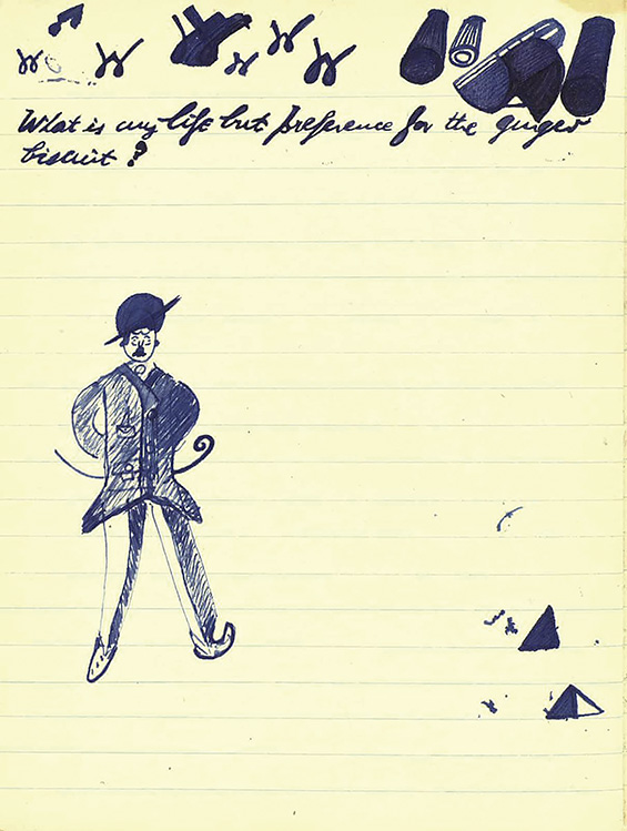 Figura 7 – Desenho de Beckett, com Chaplin e a frase “What is my life, but preference for the ginger biscuit?”