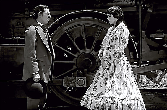 É também de balanço e de um movimento oblíquo que se trata em Buster Keaton. O filme The General, oferece-nos um de muitos momentos exemplares do seu design cómico. Aí, num belo e melancólico gag, Johnnie Gray (Buster Keaton), afundado na maior tristeza por não lhe terem concedido o alistamento, condição também requerida pela sua amada, senta-se no braço ou barra metálica da sua locomotiva. É na mais profunda melancolia que o contemplamos. Então, The General arranca e vemos Keaton a subir e a descer, numa coreografia mecânica, pendular, a sinalizar os dois pólos: o humor e a tragédia.