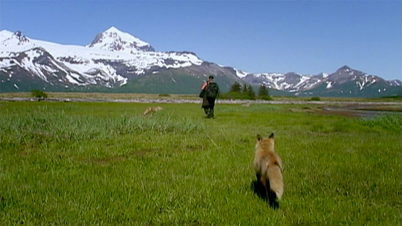 Em outro instante do filme, Treadwell está se despedindo com um urso ao fundo da cena, quando, de repente, há um silêncio e uma raposa e seus filhotes passam correndo pelo quadro inesperadamente. Herzog narra da seguinte maneira: