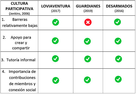 - Como primer paso en el análisis, se construyó una tabla comparativa en la cual se comprobó el nivel de fidelidad que cada caso guarda respecto a las cuatro características que Jenkins (2006) sugiere en relación con la cultura participativa.
