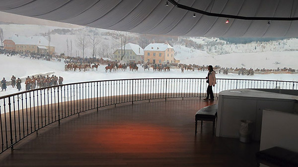 Na obra abaixo é uma imagem muito realista com representação de paisagem e de acontecimentos em perspectiva circular, representou no século XIX o estado da arte do ilusionismo visual e pinturas em perspectiva em grande escala com efeitos de luz.