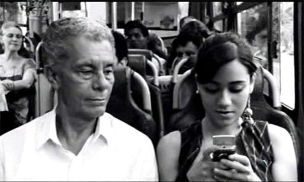 Ao contrário dos momentos fora do dia a dia dos filmes anteriores, onde os personagens estão em viagem, o personagem de Transeunte (Passerby) de Eryk Rocha (Brasil, 2010) situa-se imerso no cotidiano. Ele transita em atividades corriqueiras que se desenvolvem no seu perambular pela cidade do Rio de Janeiro, em particular no centro desta urbe. É através destes percursos aos lugares que visita que a narrativa e história de vida do transeunte se apresenta ao espectador. Este, segue o personagem como a sua sombra, tantas vezes retratada (Fig. 13).