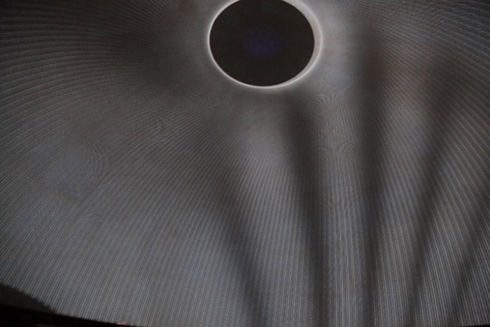 A cúpula maior, que fica sobre a menor, tem a superfície em domo que simula, em dimensão e formato, o planetário da UFSM, com seus arcos que permitem o acesso, distribuídos ao redor da parte que toca o terreno. Coberta e concêntrica à cúpula maior, temos um domo menor, no formato de uma meia esfera, dentro desta temos o mobiliário de um banco em forma de semicírculo destorcido, orgânico. Ambas as cúpulas recebem o vídeo das obras em suas superfícies internas e externas, propiciando um ambiente para fruição de imagens efêmeras, percebidas em experiencias imersivas sinestésicas.