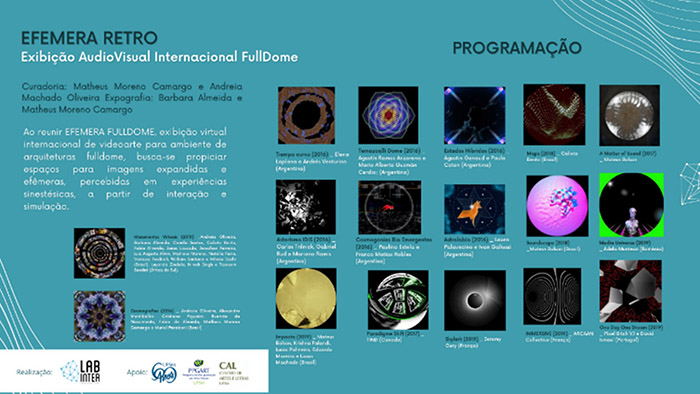 17EFEMERA Imagem Exibição AudioVisual FullDome (2019). Integra a exposição Arte - Memória - Tecnologia - LabInter (2019). Aconteceu no Planetário da UFSM. Tem curadoria de Matheus Moreno e Andreia Oliveira. Contou com as obras: Media Universe, de Adela Muntean (Romênia); DOMA, de ModiFICA e FORERO (Chile); Machinery of Blooming, de VJkET (Ucrânia); Flor, de TinD (Canada); ECHO, de Eine Sonosphäre, Franziska Hauber, Michael Gamböck e Thomas Simonetti (Alemanha); mirARTE internaMENTE e olhAR-TE tocAR-TE DESDE A LUA, de Hernando Urrutia (Portugal); One Day One Dream, de Pixel Bitch VJ e David Ismael (Portugal); Sobre a outra noite, de Calixto Bento (Brasil); Esculturas Quânticas, de Alexandre Rangel (Brasil); Skylark, de Jeremy Oury (França); HappyDeep, de Michaël Borras (França); Enquanto algo acaba, de Calixto Bento, Francine Nunes, Reinilda Minuzzi, Cintia Bittencourt, Ceila Bittencourt, Karyn Fröhlich, Matheus Moreno e Emerson Massoli (Brasil); IMMERSIVE, de ARCAAN Collective (França); MonumentosVirtuais, de Andreia Oliveira, Barbara Almeida, Camila dos Santos, Calixto Bento, Fabio Almeida, Jonas Louzada, Jonathan Ferreira, Luiz Augusto Alvim, Matheus Moreno, Natália Faria, Vanessa Fredrich, Wiiliam Santana, Milena Szafir (Brasil), Luyanda Zindela, Niresh Singh e Tasneem Seedat (África do Sul); Impacto, de Mateus Bolson, Krishna Palandi, Lucia Palmeiro, Eduardo Moreira e Lucas Machado (Brasil); PAINTSCAPES, de Thomas Vallianatos (Grécia); Gènesis, de Gnomalab e Pina (Espanha); Imersão, de Karyn Fröhlich (Brasil); Convexo, de Alejandro Casales e Antonio Russek (México); e a live performance AntiRemix2, de Marcelo Birck (Brasil).