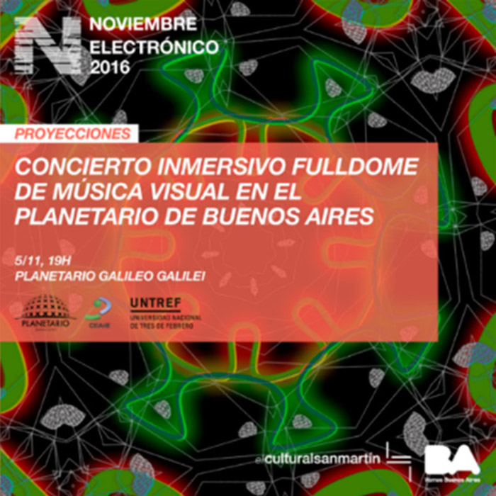 9Concierto de Música Visual en Fulldome – UVM (2016). Organizado pelo Cientro de Experimentación e Investigación en Artes Electrónicas da Universidad Nacional de Tres de Febrero e Cultural San Martín. Integrando a programação do Noviembre Electrónico 2016 e a BIENALSUR, no Planetário Galileu Galilei, da cidade de Buenos Aires. Programação e divulgação da mostra, disponível no link: http://www.ceiarteuntref.edu.ar/concierto-taller-fulldome2016