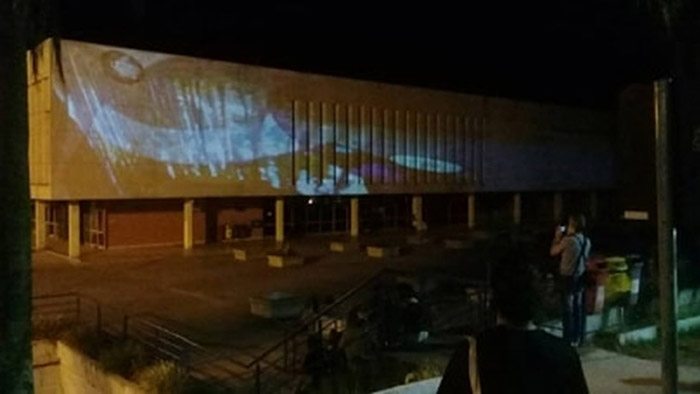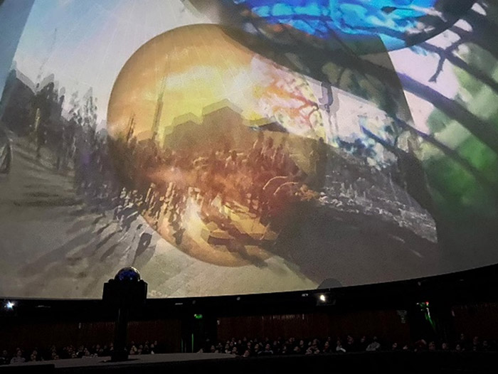 Figura 7 – Demarcar, Resistir!, de Victor Valentim e Nibêra. Registro fotográfico da exibição na mostra EFEMERA Imagem - Exibição AudioVisual FullDome (2018). Planetário da UFSM, Santa Maria, Brasil. Foto: Matheus Moreno.