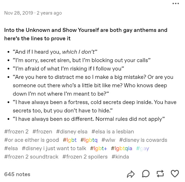 Songs from the franchise such as Let It Go (2013), Into the Unknown (2019) and Show Yourself (2019) were likewise received by the public as queer anthems. With their lyrics being adopted by queer viewers to convey their own experiences (Figure 3).