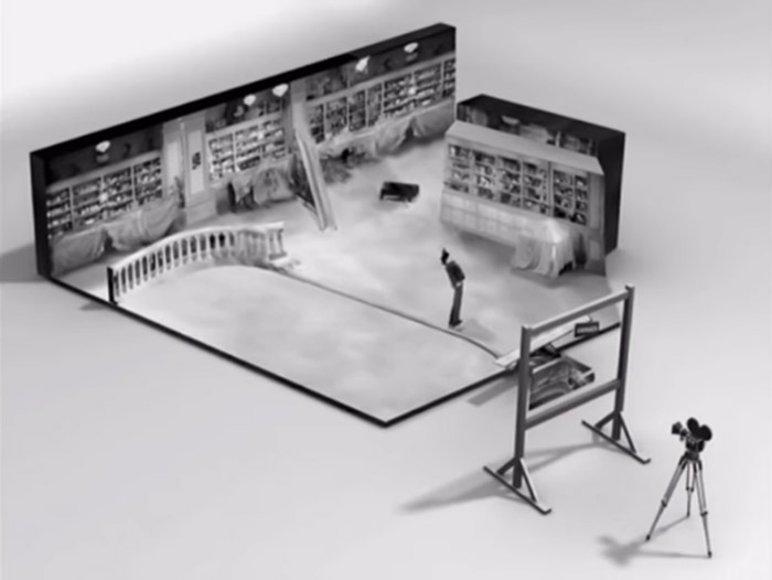 The most practical of compositing techniques is called a physical composite and, in it, the separate parts of the image are placed together in the photographic frame and recorded in a single exposure. A perfect usage example is the depth illusions seen in many of Charles Chaplin’s films (Modern Times 1936). Image 1 provides a graphical representation of the composite. A variation of the physical composite is the background projection. In this case, the separate parts are also recorded in a single exposure, but the background consists of an image or video projection onto a wall. This technique is still used today, sometimes resorting to virtual production for greater realism as it discussed ahead.