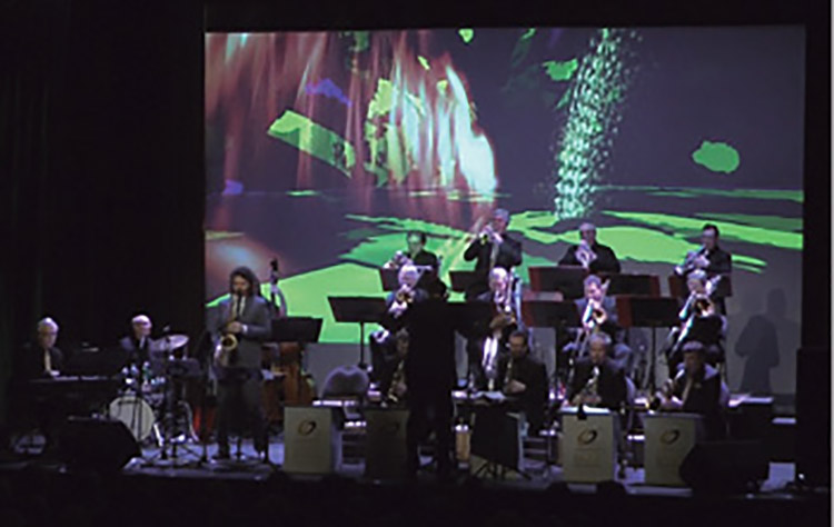My first collaboration with the Saskatoon Jazz Orchestra (SJO) occurred in 2018 (Image 1). For this performance, the theme of synesthesia fit nicely with the orchestra’s mandate to explore diversity and how individual the experience of music can be. This performance built from successful collaborations between other artists and researchers and the SJO. Guests are invited to present on their area of specialization and intersect this with the music. Both entertaining and informative, the SJO quarterly performances at the Broadway Theatre in Saskatoon are often fully booked with audiences eager to participate while learning something new.