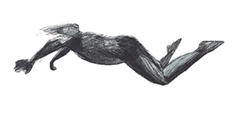 Specialized in figurative painting and drawing, I chose to use these skills for this first film. In responding to Above the Deluge, audiences commented on their appreciation for traditionally drawn animation, but also the synthesis between the traditional aesthetic and the subject matter. Wanting to capture a lack of gravity – the floating, circling, and fluidly moving and repeating melody in the music, I chose stock video footage of underwater scenes. Beginning with a swimming figure (whose body folds in and moves downwards – Image 2), this is followed by sea creatures (otters, seals, fish, and water snakes – Image 3) and deep-sea divers. Recognizing how my stock video collage approach could lead to a barrage of unrelated content, I maintained the underwater theme throughout the film. Near the completion of Above the Deluge, a significant change to the animation was made because previously dominant sounds in the preliminary recording became less audible in the final recorded music. To address my observation of the visuals being out of sync with the music, I enlarged the scenes to make the previously dominant shapes smaller. This unexpectedly added depth and dimension to the subsequent compositions.