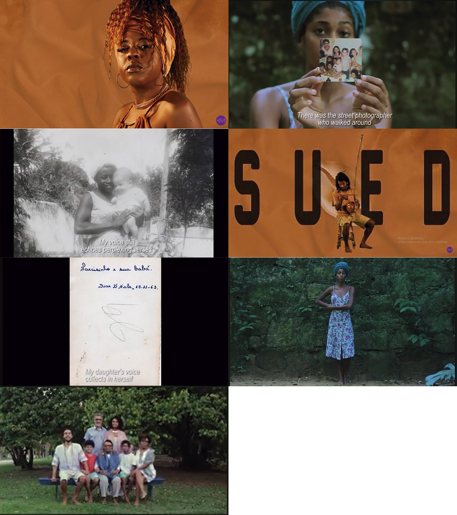 Após narrar as possibilidades do ecoar das vozes das avós, mães e filhas na performance vocal de Safira Moreira, porém em voz off, sua mãe comenta as dificuldades da família em ter fotos porque era muito caro para famílias negras, e assim, de forma resiliente e transgressora, como nos ensinamentos da pedagogia das Encruzilhadas (Rufino 2020), Safira, após a mãe dizer que elas não tinham um álbum de fotografias, começa por si, por ela mesma em cena, posando para a câmera. É como Sued, a fazer uso da corporalidade audiovisual (em seus corpos da cena/ em cena) enquanto filme, para performar poses fotográficas. Ela começa consigo, de corpo inteiro, em ambiente que traz para o corpo da cena, corporalidades da natureza, como o búzio de Sued, mas logo esse eu também se expande (é o momento da entrada da música de Mayra Andrade, que tem um nome de mulher, Juana). Sued e Safira aparecem em diversos momentos de corpo inteiro, na maioria das vezes com a frontalidade do olhar para a câmera (para o espectador?), mas convocam outras vozes e corporalidades para partilhar esta experiência. Safira, em sua pose, está descalça, se plantando em suas raízes ancestrais, para retornar ao ancestral (que não está ligado à linearidade temporal, mas à possibilidade de multitemporalidades). É a questão da encruzilhada das culturas negras revelada pelos gestos e sobretudo pelas performances do tempo espiralar, como propõe Leda Maria Martins (2020).