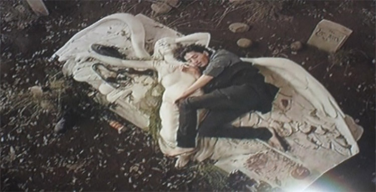 Na figura 3, a câmera exibe a imagem do cemitério do alto até chegar no personagem Gabriel que está dormindo sob um túmulo.