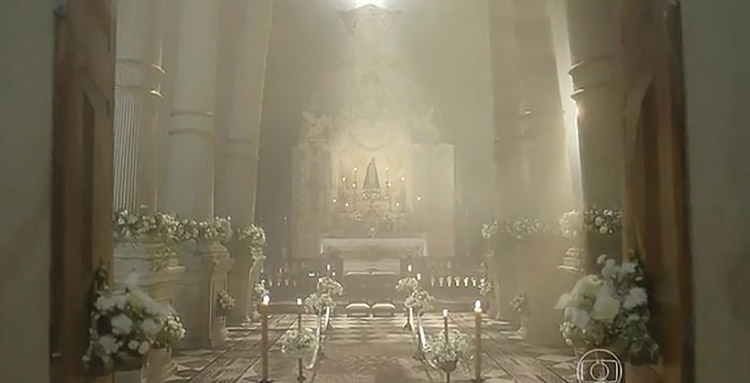 Na figura 9, a imagem é diurna, o interior da Igreja está decorado com flores brancas nas laterais da nave, pois a mesma foi decorada para o casamento de Malvina, que não ocorreu. A luminária que está na parede central ilumina o altar, mais especificadamente a capelinha de uma santa. Do lado direito, também vemos uma luz localizada. Existem três colunas em cada lateral do interior da Igreja. Do lado esquerdo, percebemos a inclinação sutil das colunas, a luz suave esconde esse detalhe.