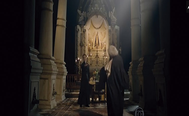 Já na figura 10, percebemos que a escuridão da noite invade a Igreja. Somente existe luz no interior da capelinha da santa e em alguns candelabros com velas acessas. Há uma luz que incide em cima das colunas do lado esquerdo que evidencia as colunas inclinadas. Porém, não visualizamos de onde a luz se origina. Há uma sombra muito grande do lado direito, no qual está o morto-vivo Padre Lauro. O Padre Joaquim está perto do altar, consequentemente perto da luz. Parece um embate de forças, a luz representada pelo Padre Joaquim e a escuridão representada pelo Padre suicida Lauro.
