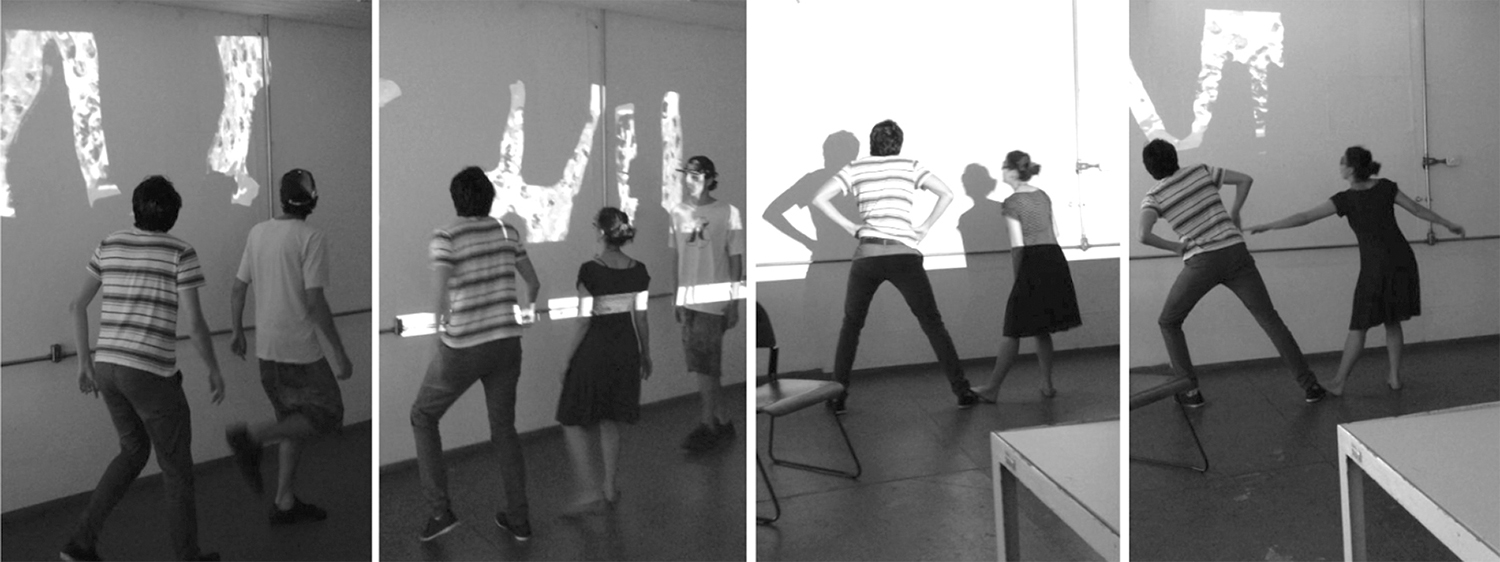 O input (corpos dançantes) estava, portanto, apartado do output (tela de projeção), alterando de modo radical a experiência do usuário inicialmente pensada no projeto. Ali, nos primeiros esboços, essa experiência pressupunha um caráter especular, no qual quem se move vê imediatamente o resultado visual da captura de seus movimentos pelos sensores. Agora, na versão final, as imagens projetadas não estão mais ao alcance visual de quem as produz. Esta separação entre a imagem e seus produtores e os espectadores permite que entendamos este trabalho como uma reorganização de dispositivos historicamente consolidados da imagem em movimento.