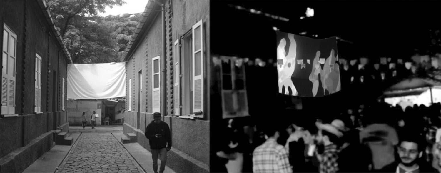 Queremos sugerir que, no “Psiquicokinectico”, foi, em parte, por conta da ‘demasiadamente real’ presença das sombras que elas foram sendo gradualmente descartadas. A solução espacial para resolver este problema, que já se insinuava nos testes mostrados aqui na Figura 10, foi afastar radicalmente os dispositivos de captura e projeção das imagens dos corpos cujas silhuetas dançantes alimentavam o sistema. Desde o desenho inicial, percebe-se um interessante processo de içamento. Se no primeiro desenho, a base da imagem coincide com os pés, e se nos protótipos da experiência eleva-se à cintura, na versão final do projeto, a tela acaba por posicionar-se acima das cabeças. O sistema foi instalado para integrar as atrações de uma festa promovida pelos alunos na ESDI. Próximos à pista de dança, estavam posicionados o Kinect, a câmera de captura de vídeo e um computador no qual as imagens eram processadas. Longe desse conjunto, um lençol branco foi suspenso e esticado, ocupando toda a largura do boulevard, via principal da Escola (Figura 11).