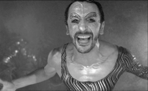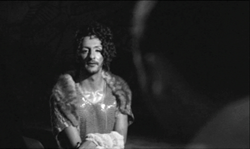 Outra suspensão temporal na sequência. A apresentação musical de Clécio é antecipada pela apresentação do filme, Prosopopéia Herética, em Super-8, com poesia narrada por Clécio.. O palco está escuro. A única fonte de luz é da imagem projetada. Contraluz do corpo de Clécio. O som das cordas de um violão. Uma luz é direcionada a Clécio, no palco vestido de brilhos e um casaco de pele, com flor no cabelo, calça dourada colada, acende.