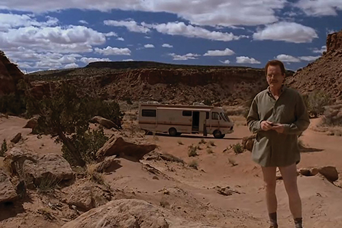O primeiro contato com a protagonista, logo na abertura do piloto de Breaking Bad (T01E01), dá-se através de uma sequência de ação, na qual ele veste apenas uma cueca e uma máscara de gás, dirigindo um trailer velozmente, chacoalhando, por uma estrada de terra. Ao seu lado um homem desmaiado, completamente vestido, e também usando o equipamento de segurança. Materiais de um laboratório de química caem e quebram o tempo todo e vários produtos químicos são esparramados pelo veículo. Entre os destroços, dois homens sem máscara e de origem latina, parecem estar mortos. Tudo o que se pode deduzir da personagem seminua é que aparenta ter uns cinquenta anos e que está extremamente nervoso.