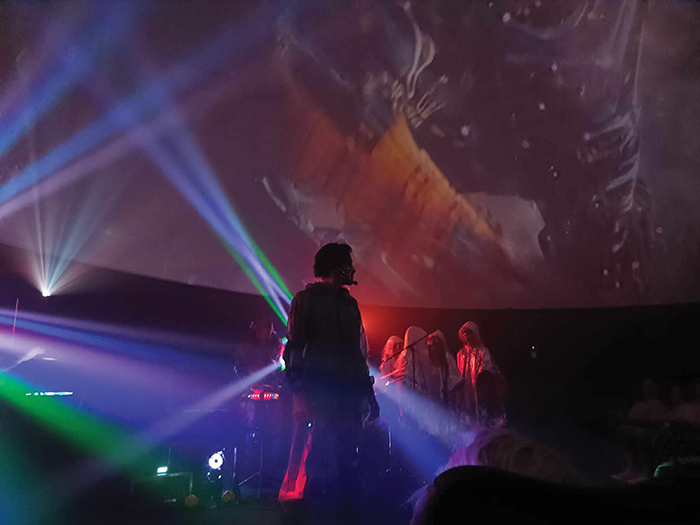 The opera begins in complete darkness, utilizing small remote-controlled mobile robots to initiate the scene. These robots establish a relationship between scale and the architectural space of the planetarium, exploring alternative representations of bodies and agency within the dramaturgy. As the robots traverse the space, they generate a low-frequency drone sound, and upon reaching their designated endpoints, they leap, marking the transition into the main performance. These robots function as vehicles symbolizing entities on a journey, creating a deliberate contrast between the vast grandeur of the space and the absence of human bodies on stage. This interplay between robotic movement, spatial scale, and absence emphasizes the perception of a futuristic narrative, underscoring the significance of the artifacts in the broader context of the opera. To navigate the improvisational methodologies employed in the performance, a guiding principle was introduced for the actors, dancers, and singers. In moments of uncertainty or disconnection, performers were instructed to pause and enter a suspended temporal loop of movement. This framework allowed performers to rejoin the group organically, embodying the concept of temporality frozen in action. These moments of suspension created sculptural forms that evoked states of descent, stasis, or bodily surrender, contributing to the opera’s exploration of the human condition within an entropic and technological landscape. Improvisation within the opera challenges traditional artistic conventions that view the creation of art as a planned process executed by a composer or artist, with performers serving a solely interpretative role. By incorporating improvisation, the opera blurs the boundary between interpretation and creation, raising questions about the nature of the performer’s contribution as interpeters and in other moments authors. In performing arts, structures are often considered “types, while individual performances are seen as “tokens” (Bresnahan, 2015).