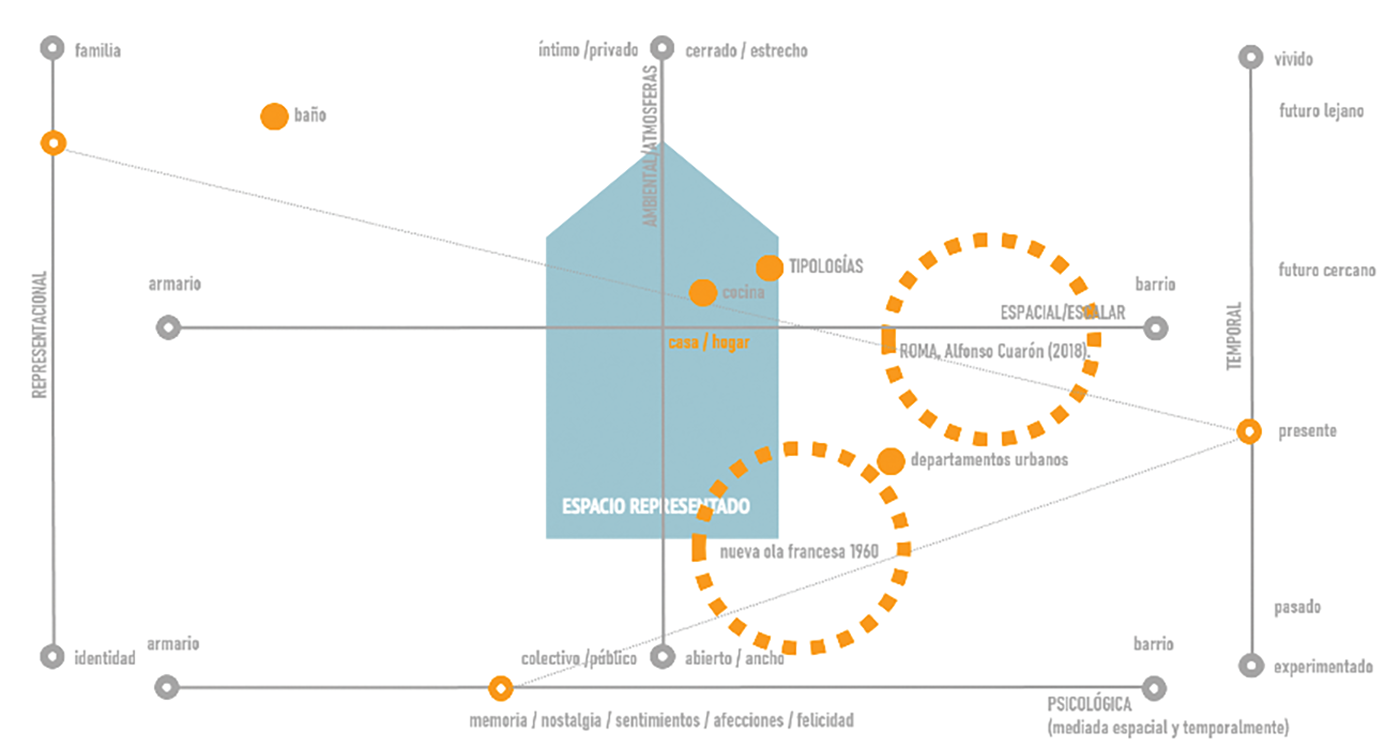 Through the architectural-cinematic representation, everyday life is shown in filmic space-time through the occupation of the domestic space: kitchen, bedroom, bathroom, etc.; including all its elements: doors, windows, stairs, elevators, etc., as well as the objects emotionally or affectively linked to its inhabitants are key elements in defining the affections for the home.