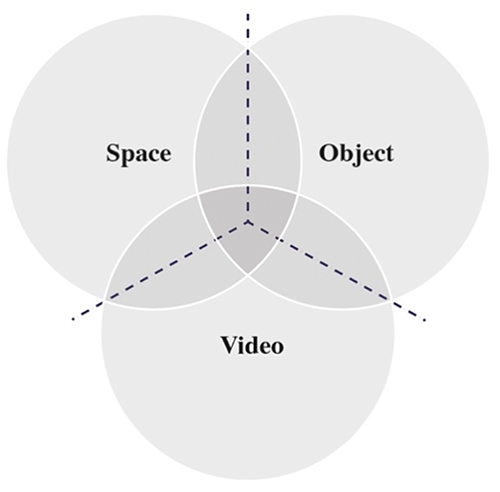 The mutual relationships space, object and audiovisual components on which our research is based can be summarized in the following diagram.