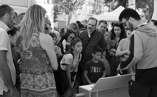 The key difference between our approach and that of a classic transmedia scenario can be summarized as follows. Where the transmedia format usually takes mainly place in the dialogic, although highly connected – and to some extent ubiquitous – world of networked social media, our design is based on a synchronic, ‘live’ and site-specific environment. In this context our approach is based on triggering the visitors’ active presence and participation, ultimately relying on their word of mouth within the limited space of an event lasting one day and a half.