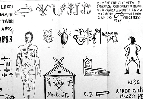In the second half of the 19th century, Cesare Lombroso, founder of the Italian positivist criminology school, developed a theory establishing a direct connection between the somatic traits of individuals and their social attitudes (Lombroso 2013). Lombroso devoted a great deal of, almost maniacal, attention to the language of tattoos, by thoroughly recording those of hundreds of the inmates of his time. Part of this research was published in the 1897 and last edition of his famous L’uomo delinquente (The Criminal Man). The book includes a repertory of symbols and signs, presented in form of a description of the criminal attitudes of the various inmates.
