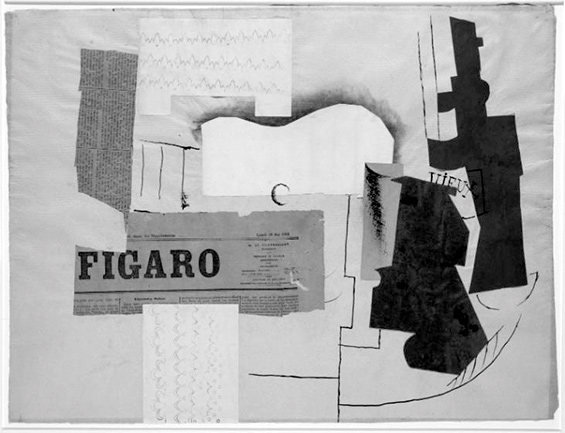 Figure 1 - Pablo Picasso, Bottle of Vieux Marc, Glass, Guitar and Newspaper, 1913. Collage and pen and ink on blue paper, 46.7 x 62.5 cm. Tate Modern, London