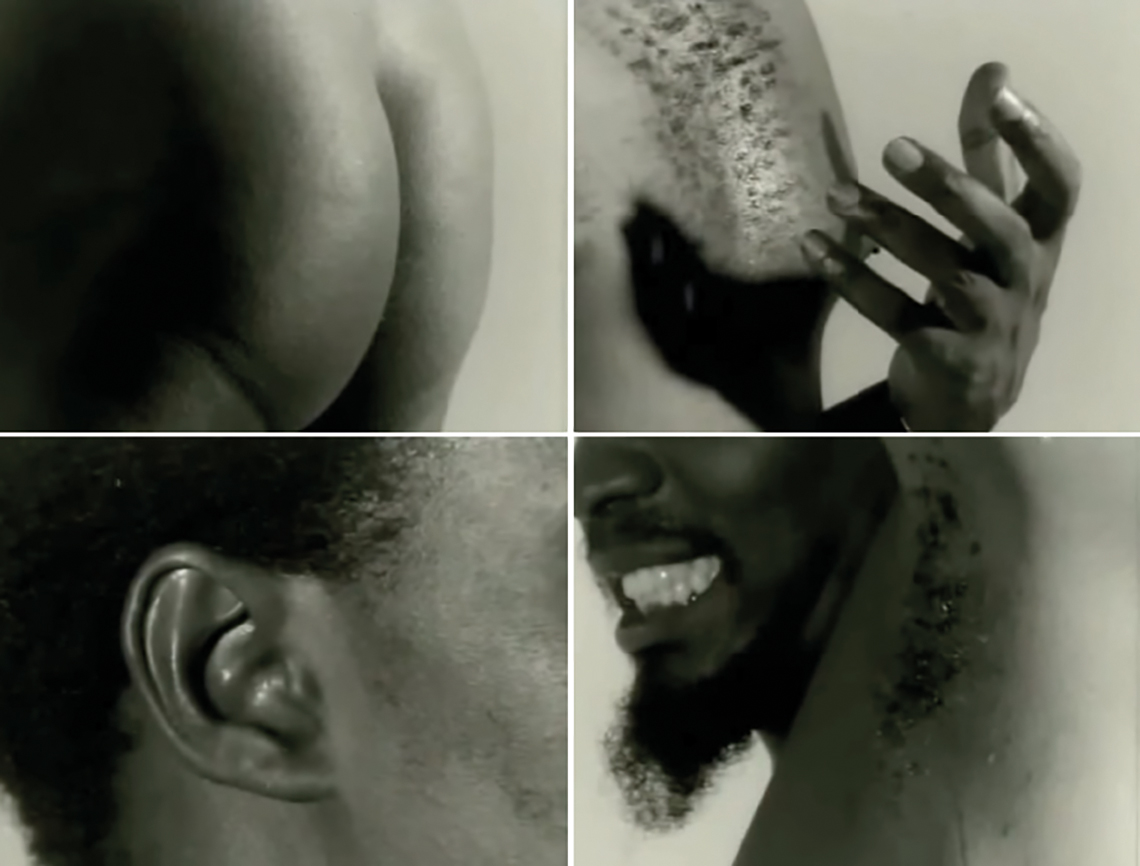 Após essas cenas, aparece um plano frontal próximo ao rosto, tipo de plano que seguiu recorrente por todo o filme, demarcando a representação do corpo negro. O fundo branco realça a estratégia do corpo como suporte. O olhar sempre fixo para o espectador é destacado por dois elementos: o corpo negro como representação e o fundo branco que realça a estratégia de ressignificar o corpo negro. “Quer dizer, o corpo é um coletivo dirigente e não um monarca que governa sozinho, a exemplo da consciência” (Sodré, 2002, p. 21). O olhar que fixamente parte para observar o espectador.