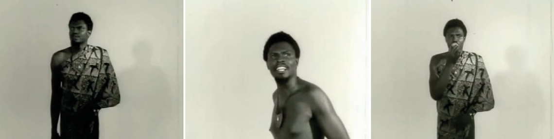 As imagens seguintes intercalam cenas do personagem dançando vestindo uma capulana7 na cintura e um pente-garfo na cabeça. O pedaço de tecido colorido, assim como o pente-garfo, remete à ancestralidade e registra o empoderamento das realezas africanas. Objetos carregados de histórias e simbologias que marcam elementos das sociedades africanas, usados para indicar status, identidade, região geográfica, estado civil, classe social e tantos outros. A cena gera encanto e curiosidade. “Zózimo ressignificou todo o corpo negro” (Gloria Rolando). Os adornos na cabeça e no pescoço simbolizam o poder das realezas africanas que novamente encara a câmera.