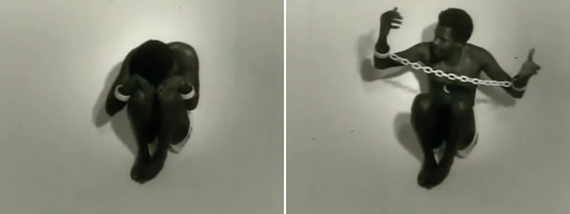 O último plano desse bloco funciona como um emblema dessa nova condição. Trata-se de um plano médio como o personagem deitado e atado com uma corrente branca, com os joelhos encolhidos até́ o peito e as mãos sobre a cabeça dobrada. A posição fetal ressalta, de certa forma, as dores e os sofrimentos do colonialismo.