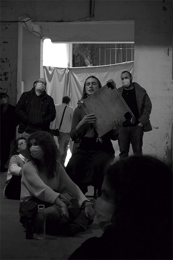 Figura 24 - Registo fotográfico da performance instalativa multimédia “Arquetipo(grafia) obscura do feminino”, (25/10/2020), Lisboa. (Fonte: Stratos Ntontsis).