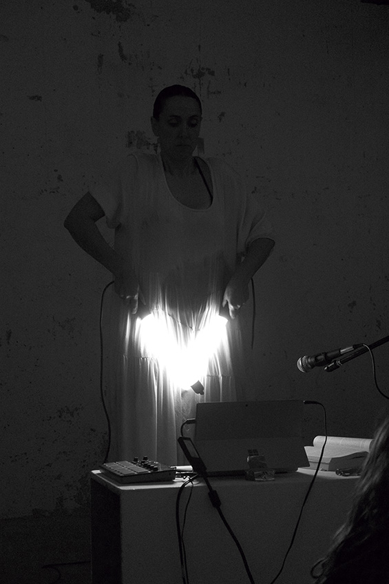 A performance “Arquetipo(grafia) obscura do feminino”, resulta de uma instalação multimédia performativa, desenvolvida a partir da relação entre a ação in loco (Corpo/Presente/Corpo Virtual), versus a dinâmica Tempo/Espaço (real e digital, e diálogo som/palavra na imagem); como dispositivo performativo e tecnológico, que disponibiliza ao público a possibilidade de escolha — entre ver as ações que ocorrem em tempo real (no espaço), ou, os acontecimentos produzidos no vídeo e projetados. Se o espaço “real” traz em si o lugar da força do corpo, dos movimentos e da energia daí gerados; o espaço do vídeo (virtual) incorpora per si um conteúdo mágico e ritualístico.