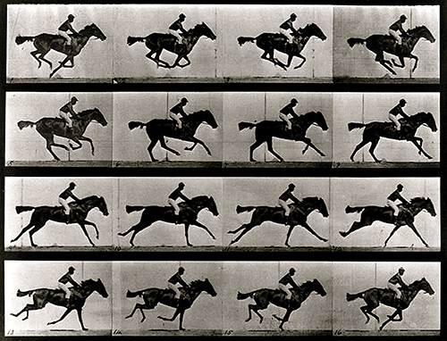 O filme nada mais é do que a concatenação de diversas “fotos” capturadas sequencialmente, em geral cerca de 24 fotos (que chamamos de frame) por segundo. Precursor do cinema, o fotógrafo Eadweard Muybridge já visionava-o através de seu experimento de análise de movimento do galope de cavalos1 através da fotografia. Para isso utilizou-se de 12 câmeras posicionadas lado a lado acionadas pela largada do cavalo através de um fio2. Aqui a sequência de fotografias já aparece para descrever algo – no caso o movimento do cavalo – assim como posteriormente aconteceria nos planos cinematográficos.