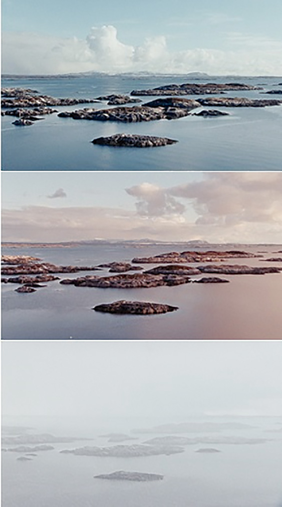 Si retomamos el inicio de la pieza nos encontramos ante un paisaje oceánico cuyo contraste varía. La cámara fija nos muestra diversos tableaux afectados por las diferentes luces del día, captando así el tránsito de las formas rocosas definidas por la luz al borrado de las figuras.