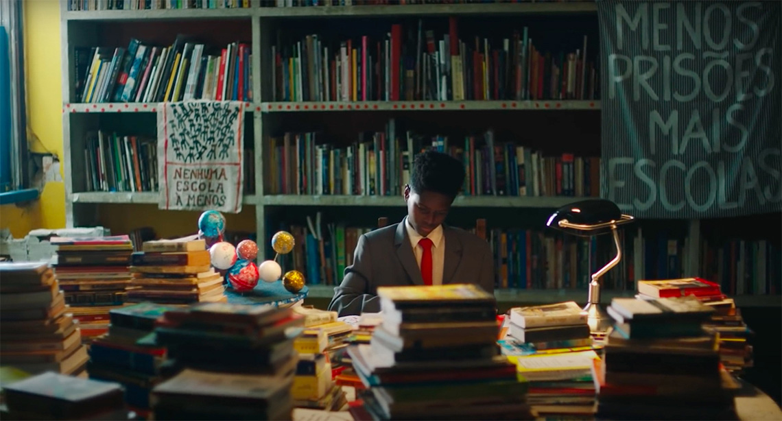 Mais um corte mostra um jovem vestido com terno e gravata e cercado de livros. Vemos mensagens em destaque no fundo da cena: “nenhuma escola a menos” e “menos prisões, mais escolas”. A música continua “Eles têm medo pra caralho de um próximo Obama / Racista filha da puta, aqui ninguém te ama / Jerusalém que se foda, eu tô à procura de Wakanda, ah” (Exu do Blues 2018).